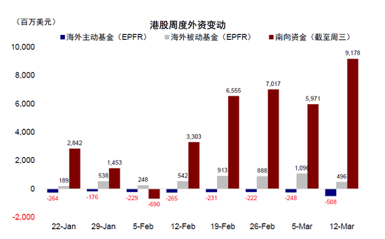 然而,与市场走势“不匹配”的是,南向资金依然大举流入,成为关注焦点。继两周前单周净流入创2021年后新高后,上周一(单日净流入296亿港元)与周三(单日净流入262亿港元)一举刷新沪深港通开通后单日净流入新高。相应的,本轮外资虽有流入但幅度不大,且仍然以被动和交易型资金为主,主动资金只有部分回流(主要以亚太区域资金为主,但也已标配甚至小幅超配)。这说明:一方面南向资金或是本轮的主力之一,另一方面也说明南向资金也无法起到绝对的“定价权”。因此,复盘历次南向大举流入的情形与影响,测算未来流入空间和“定价权”就成为判断本轮市场反弹持续性的重要参照。我们在本文中将作出详细分析。