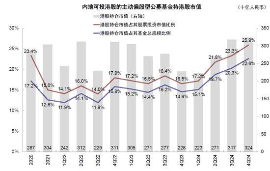 图表12:截至4Q24,港股持仓占内地可投港股主动偏股型基金股票投资市值的25.9%
