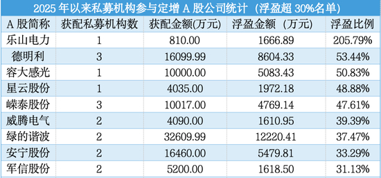 据第三方平台统计,截至5月21日,今年以来共有27家私募管理人参与23家A股公司定增,合计获配金额为19.43亿元。按当日收盘价统计,合计浮盈金额达5.28亿元,浮盈比例为27.19%。