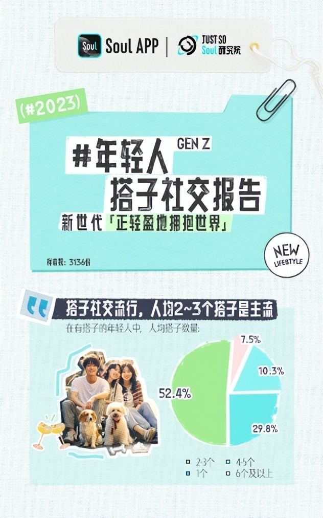 Just So Soul研究院于近日发布了《2023年轻人搭子社交报告》,通过该份报告来深度解读年轻人热衷找“搭子”背后隐藏的社交趋势,Soul作为年轻人专属的社交平台,近年来在不断丰富自身多元性,并为用户带来了不一样的社交体验。