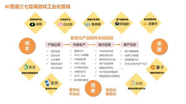 事实上,三七互娱是业内极早便开始探索AI赋能业务的游戏公司,早在2020年就提出了要用AI赋能游戏工业化的重要发展方向。目前,三七互娱已经构建出了一条成熟、完整的游戏工业化管线,率先实现了AI在游戏研运环节的全链赋能。其自研的九大中台产品贯穿从产品立项到研发,再到发行运营和资产沉淀的研运全流程,打造了一整套嵌入AI与大数据技术的数智化产品矩阵。