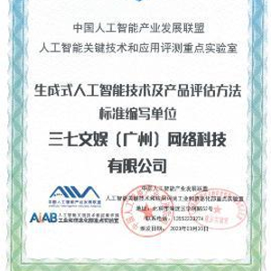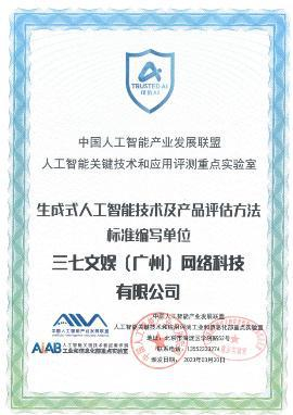 为了给国内的生成式AI应用健康发展提供保障,中国信通院发布《生成式人工智能技术及产品评估方法》系列标准第一部分“技术能力”和第二部分“产品能力”(以下简称《标准》)这也是国内的首个生成式AI标准。三七互娱作为该系列标准的编写单位之一,获得由中国智能产业发展联盟颁发的“标准编写单位”证书。