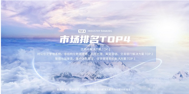 7月12日,赛迪顾问权威发布《2022中国银行业IT解决方案市场份额分析报告》,针对2022年度中国银行业发展状况、银行业整体IT投入规模、银行业IT解决方案市场规模以及各个细分市场规模及其市场份额等进行了全面深入的阐述与分析,并对未来五年的市场发展趋势进行了预测。报告显示,2022年度中国银行业IT解决方案市场中,天阳科技位居第四。