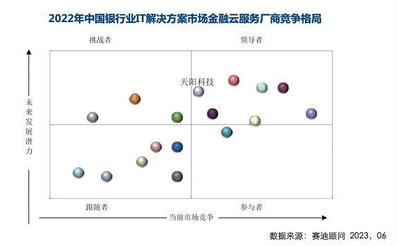 同时,报告指出,在银行加快数字化转型的大力推动下,金融云服务市场呈现出相对旺盛的增长态势,2022年度的金融云服务市场规模为62.08亿元,同比增长了15.6%。天阳科技也凭借出色的表现,成功跻身领导者象限。