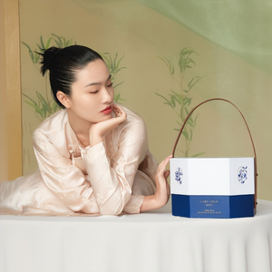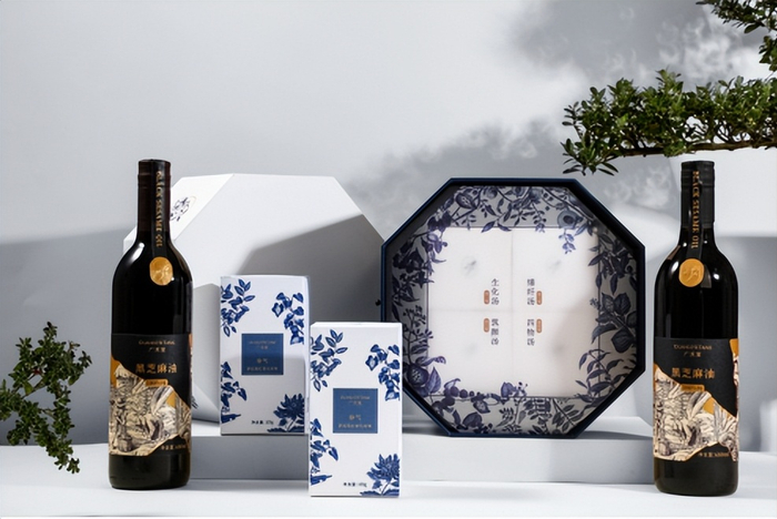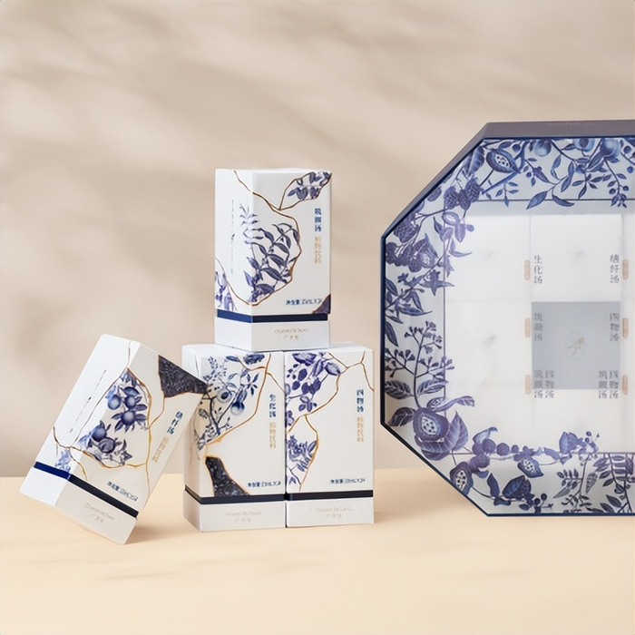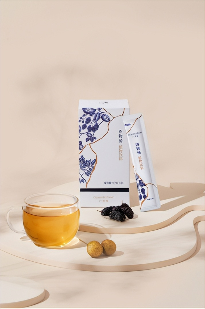 比如品牌视觉的呈现上,广禾堂创新融入了“金缮青花”的概念:青花是中国瓷器的代表,金缮是用来修复珍贵瓷器的传统工艺。品牌希望透过古韵典雅的视觉升级去传递品牌理念——以百年传统滋补文化的匠心传承与创新,帮助当代女性迎来修复和新生的蜕变。