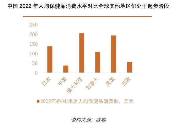 加上,中国经济发展由“高速增长阶段”迈入“高质量发展阶段”,2022 年中国GDP 增速为3%,人均可支配收入持续提升,2022 年达到3.69 万元,相当于日本20世纪80 年代水平,而当时正值处于日本健康食品市场规模快速增长的前夕。根据欧睿数据,日本、澳大利亚、加拿大、美国等国人均保健品消费金额由2008年至今均呈逐年爬升的增长情况。中国人均保健品消费额水平相对其他地方来得低,2022 年为例,中国人均年度保健品消费额为38 美元,对比澳大利亚、美国、日本、加拿大、西欧同年人均消费额分别在205、194、138、110、56 美元而言,相当于澳大利亚及美国人均消费的两成以内,亦仅为日本人均消费水平的30%,显然中国人均保健品消费额仍有较明显的成长空间。