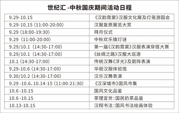 为强劲助力城市“夜经济”新势能,燃爆商圈新活力,世纪汇在中秋国庆之季推出一系列精彩夜间游园活动。“《汉深墟市》国风市集”热闹的长安古街夜市,开启汉服周边手工配饰、缠花、金丝凤、点翠、民间小食,民俗非遗等好物贩售,琳琅满目。“灯笼游园会”徜徉在花灯街市,打卡灯笼长廊,霓虹闪耀。9.29中秋之夜更有流传千年的拜月仪式震撼上演,夜生活节奏越发高涨,同时深受喜爱的中秋欢乐猜灯谜,VIP会员凭任意小票即可参与,更有机会获取团扇等精美礼品。“汉风民间游戏工作坊”画团扇画灯笼、投壶等游戏区域,多角度互动体验感受千年的生活场景,回味无穷,VIP会员凭小票即可参与,并可领取精美礼品。丰富多彩活动汇聚,世纪汇与您穿梭时空,欣赏良辰美景,共度佳节。