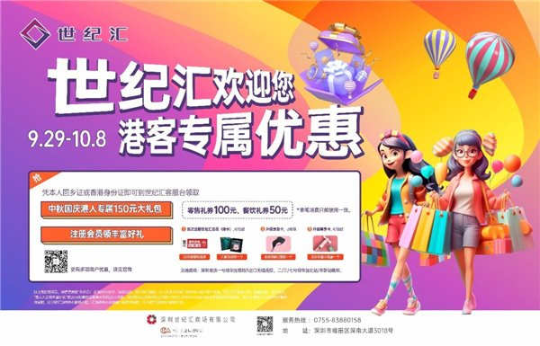 中秋国庆期间,世纪汇更为香港同胞精心准备了丰厚的节日大礼,9月29-10月8日,香港顾客凭本人回乡证或身份证即可至世纪汇B1客服台换领价值170元消费礼券和精美礼品,数量有限,送完即止。更有多项商户优惠:美妆品牌「思妍丽」268元即可享身体SPA(原价1380元),烧鸟&烧肉店「福元气烧肉」全场单品原价6.8折优惠(套餐、团购不参加),原创服装品牌「inshop」及「J+C」满1000减300,满600减150,深圳首家沈浸式情景体验馆「X 先生密室」最高享受7人减280元等等,更多商户优惠可关注世纪汇官方微信。