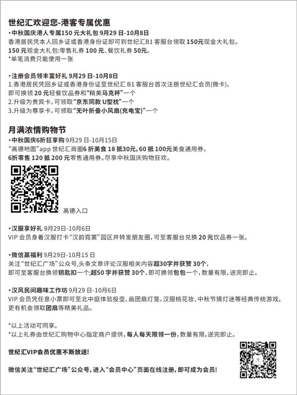 9月29-10月15日,世纪汇节日福利享不停:“高德地图”app世纪汇商圈6折优惠,VIP会员身着汉服打卡及评论有机会赢取礼券、钥匙扣、包包等潮流礼品,更可体验汉风民间游戏工作坊。来世纪汇,尽享中秋国庆购物狂欢。