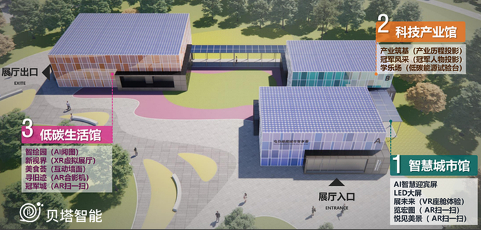 室内面积约600平方米,整体采用“大主题、多节点”布展思路,主题分别为智慧城市、科技产业、低碳生活,融合大数据、AR、VR、XR、互动投影、互动游戏等技术,搭建数十个科技体验场景。