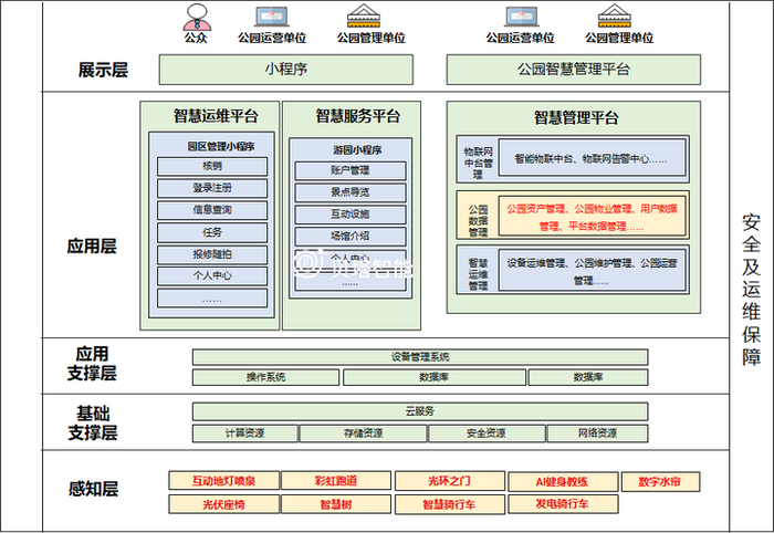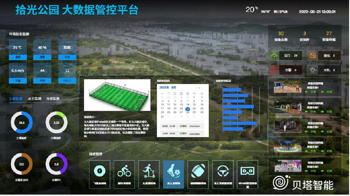 智慧公园运营管理系统利用物联网、云技术、大数据、移动互联网、5G、人工智能等新技术,以公园场景为载体,实现各部件可视化管理,通过“园区智慧运营管理一张图”,将园内所有智能设备管理、场馆管理、园林养护(土质监测、虫情监测等)、树木养护等版块在智慧控制中心的中控大屏上进行呈现,实时、动态、直观的对园区内设备从宏观到微观进行全方位管理。全力打造公园服务与管理两大体系,为公园提供完整的信息化服务、管理及规划建设,以提高公园管理的人性化、精细化和智能化,提升公园整体服务管理与管理水平,打造安全、高效、人性化的城市公共空间。