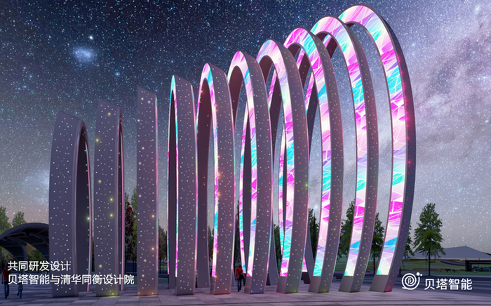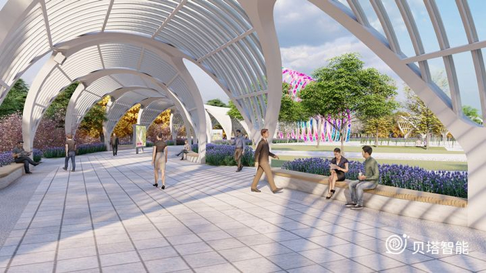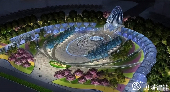 在贝塔智能与清华同衡设计研究院整体设计中,拾光公园、光环门、银河廊架、智慧大树、音乐喷泉、彩色圆舞曲、智慧水帘等等都是公园的主题亮点。