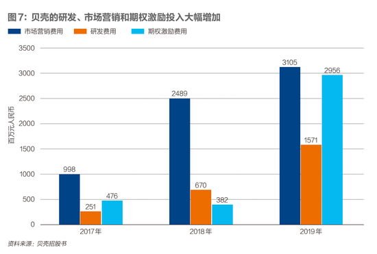 招股书显示,2017、2018、2019年,贝壳的研发投入持续增长,分别为2.52亿元、6.71亿元、15.71亿元;市场营销投入分别为9.99亿元、24.90亿元、31.06亿元;员工期权激励投入分别为4.76亿元、3.82亿元、29.56亿元。