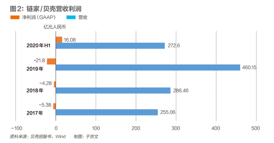 贝壳招股书显示,按照美国通用会计准则(GAAP),这家公司过去三年都在亏损,2019年亏损21.8亿元。即便按非美会计准则调整,2019年16.56亿元净利润对应每股18美元,市盈率也在80倍以上。历史上,只有谷歌、脸书、亚马逊这样的公司上市时能拿到这么高的溢价。