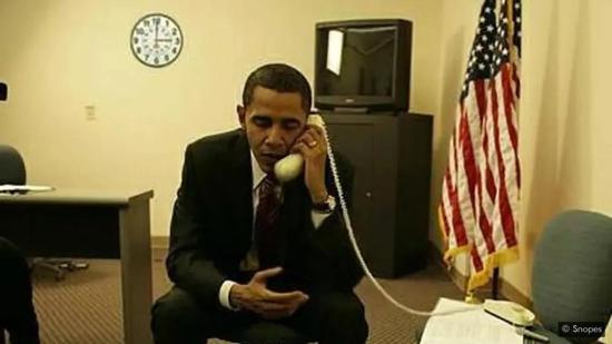 这张奥巴马的照片在2008年流传,但它是假的——时钟就是线索,它源于希拉里在3点钟拿起电话的一则电视广告
