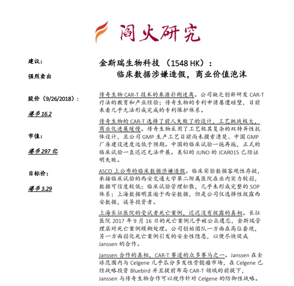 2018年9月底,匿名研究机构阎火接连发布两份做空报告。首份报告质疑金斯瑞子公司南京传奇生物在CAR-T领域的技术能力,怀疑其在ASCO上公布的LCAR-B38M临床数据造假,LCAR-B38M死亡案例披露不及时,与强生的合作存在投机性,强烈建议卖出金斯瑞股票。