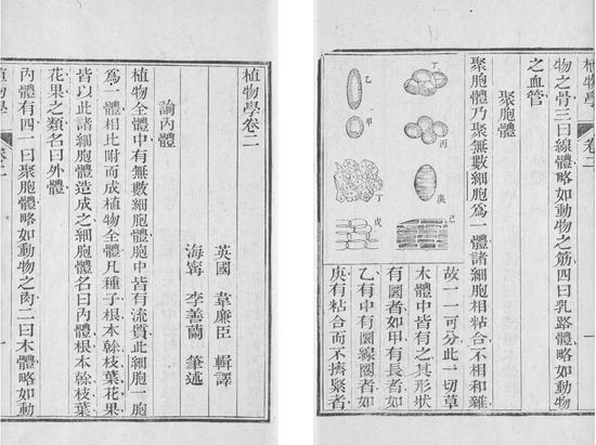 1852年夏,李善兰来到上海墨海书馆,向来华的外国传教士展阅自己的数学著作,受到伟烈亚力等人的赞赏。从此,他开始与伟烈亚力(Alexander Wylie)、艾约瑟(Joseph Edkins)等人合作翻译西方科学著作,先后翻译出版了等多部重要作品。1858年,墨海书馆出版了李善兰与英国传教士韦廉臣(Alexander Williamson)、艾约瑟(Joseph Edkins)合作编译的《植物学》(下图),这是中国介绍西方近代植物学的第一部书籍,被视为西方近代植物学传入中国的标志,汉语“细胞”一词最早就出自这部译著。