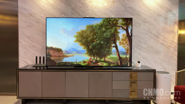步入北京中海首钢·长安云尚华为智慧体验空间后,目光就被放置在客厅内的华为智慧屏X65所吸引。4K 65英寸LG深度定制的OLED面板不间断播放着精美的壁纸,动态播放的画面映衬在黑色的电视柜上,为现场增添了一丝梦幻般的氛围。也得益于178°的可视角度,在入门的一刻,即使你的视角是在侧视它,同样会获得不错的观感,而当你步入客厅,身体慵懒地陷入沙发后,点亮华为智慧屏X65的那一刻,精彩就呈现在你眼前。