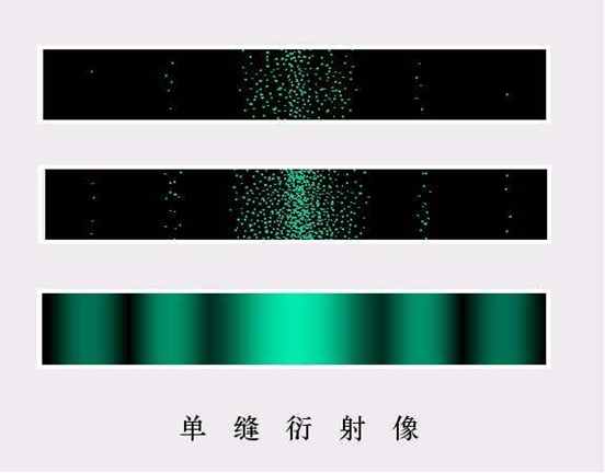 我们再把光源不停地减弱重复此实验,结果在屏幕上发现,在每个确定的时刻,看到一个点、一个点出现。实验重复了很多次之后,这些点的分布概率跟图中的分布是完全一样的。但是单次实验当中出现的是一个点,这就引出了所谓的单光子概念。后来的科学告诉我们,其实光是由很多小颗粒组成的;这些小颗粒就是光能量的最小单元,叫做光量子。