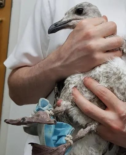 今年7月,英国一只小海鸥就被废弃的口罩缠住了脚,无法挣脱飞翔。等数周被人发现后,它的关节已经肿胀了。