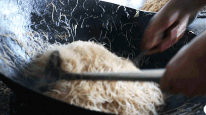最先的咸菜面老林觉得必须他来,一锅好几斤面干,别人不能驯服他们,炒不好就坨了焦了,唯有他有能力控制场面。一手筷子一手铲,边夹边抖,面要根根散开,而锅底不能糊。