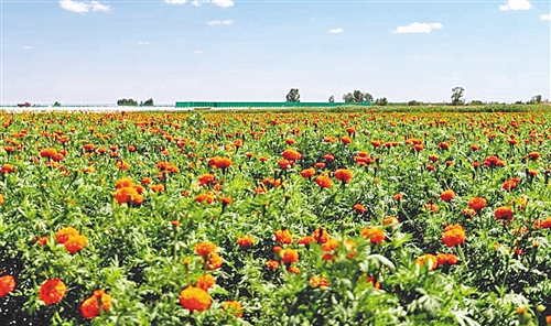 而在民勤县三雷镇建新村,万寿菊花开似海、朵朵灿烂,工人们正穿梭花丛中,忙着采摘万寿菊花,企业相关人员正在对色素万寿菊进行理论测产。