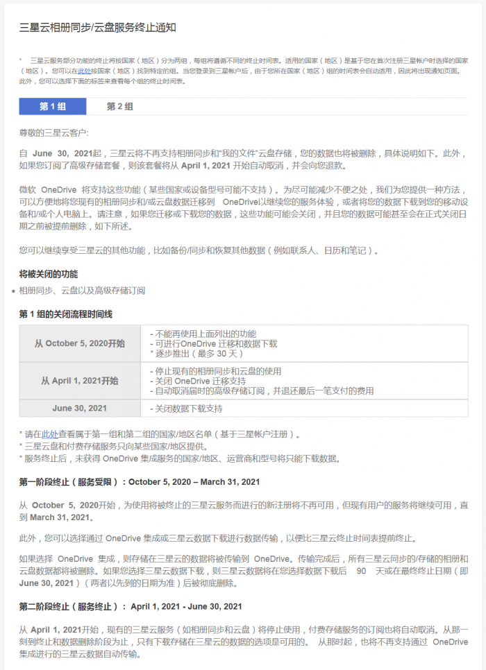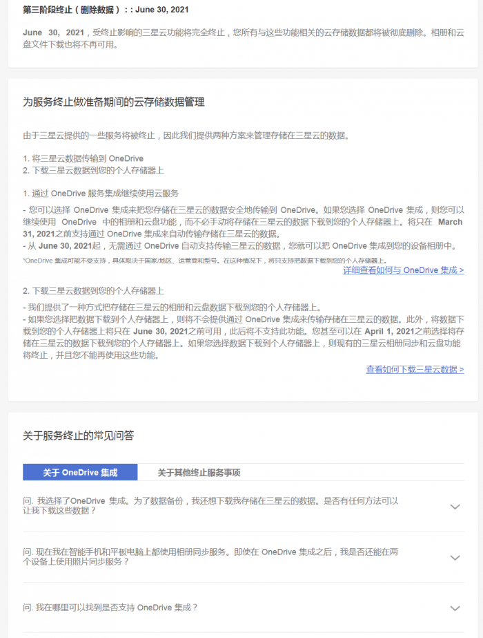 三星表示:“从2021年4月1日开始,现有的 Samsung Cloud 服务(例如Gallery Sync和Drive)将停止使用,对付费存储服务的订阅将自动取消。到服务终止和数据删除阶段,Samsung Cloud 只提供下载选项。而且,不支持集成 OneDrive 自动传输 Samsung Cloud 数据”。