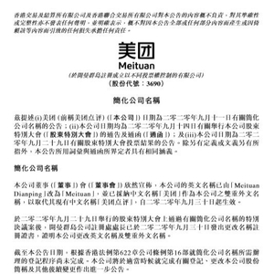 9月11日,美团就曾发布公告称,公司名称拟简化为美团。股东特别大会审议通过后,其在香港联交所的股票名称将启动相应名称简化流程,将由开曼群岛公司注册处正式办理更名并发放新的公司证书,中英文名称分别简化为美团和Meituan,股份代号保持3690不变。公司名称的简化不会对业务方向、组织架构、公司运营等产生任何影响。
