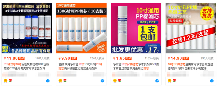 其中PP棉滤芯的价格十分便宜,10寸大小,重量为120克的PP棉滤芯(PP棉克数越高,代表可吸附的杂质越多,寿命越长),淘宝上的批发价格1-2块钱就能买到一支。