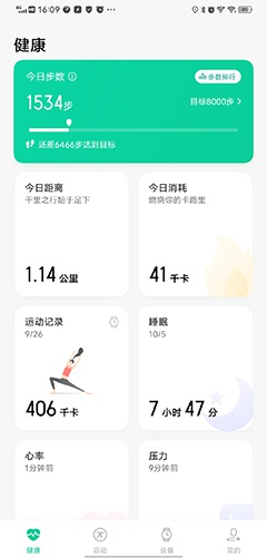 包括今日步数、今日距离、今日消耗能量情况、运动记录、睡眠时间、心率、压力、血氧饱和度。并且每个卡片都可以编辑,虽然手表上也可以显示,但在手机端查看更加详细。
