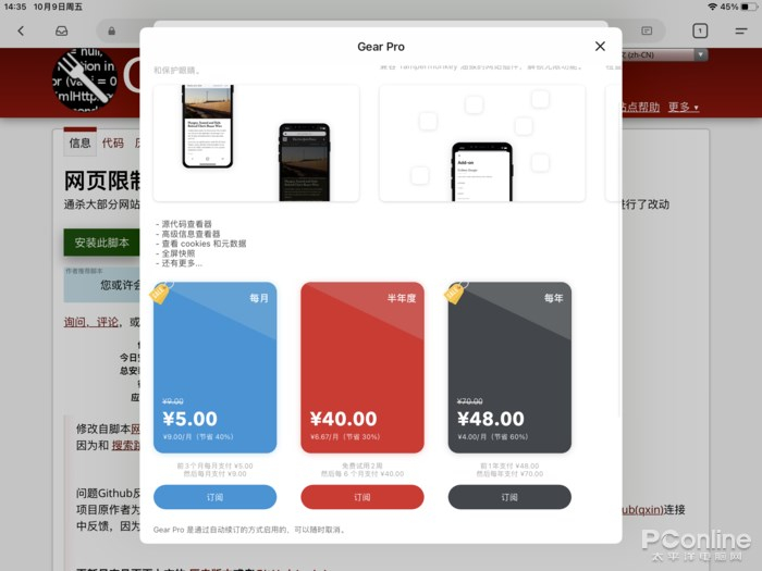 注意,Gear Browser 安装插件,是需要升级到高级版的。高级版需要付费订阅,不过 Gear Browser 提供了两周的免费试用期,这点还是比较良心的。如果你不想付费,在 iOS 中取消订阅即可。