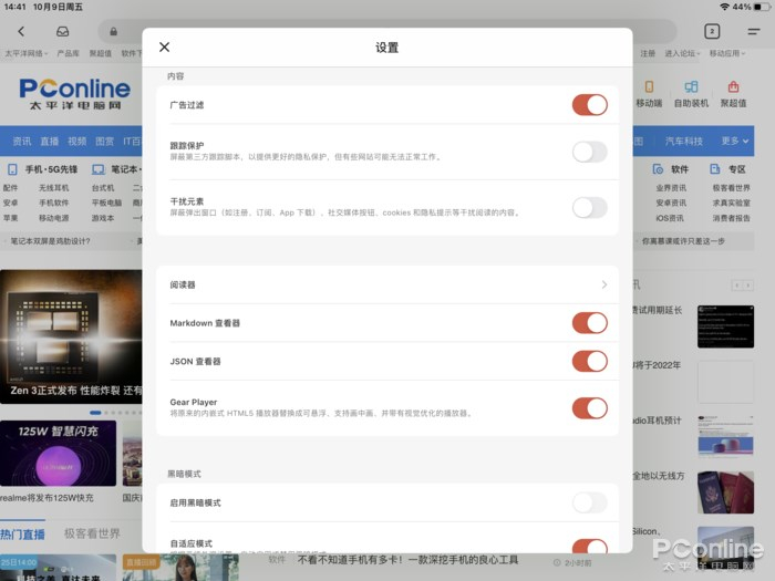 Gear Browser 自带了一些实用功能,例如去广告功能,开启后可以拦截页面的广告;又例如跟踪保护,可以更好地保护隐私。而笔者觉得最有特色的,可能就是 “Gear Player”了,这个功能可以把网页的 HTML5 播放器换成浏览器自带播放器,从而实现画中画、画质增强等功能,还是很不错的。