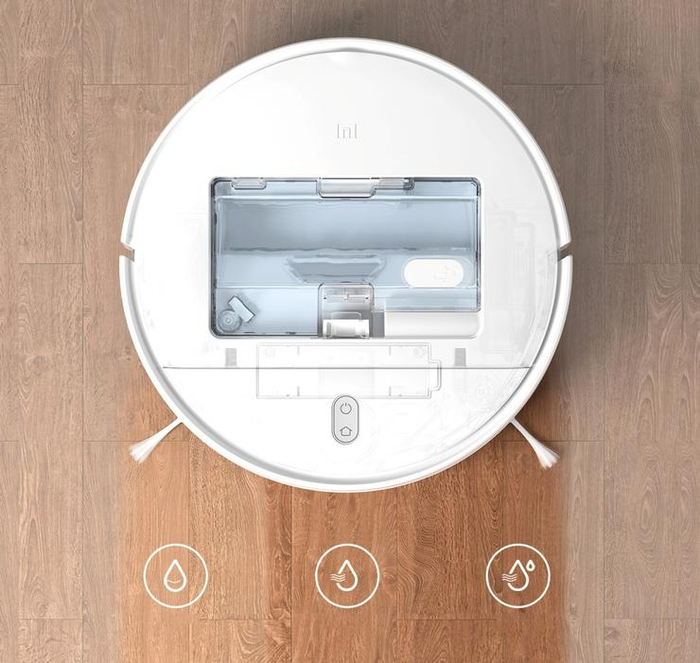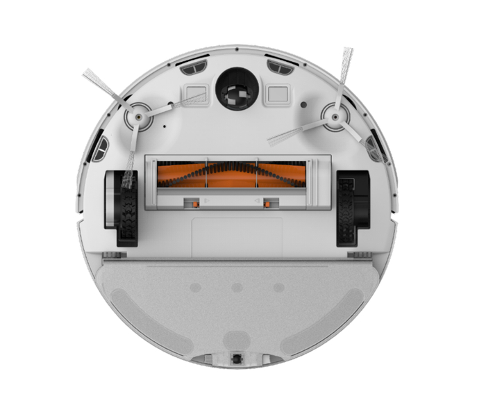 底部,带有防跌落传感器(防止在楼梯边摔落)、两个起尘刷、一个主刷,加上非常显著的水箱组件安装区域,让它具备了清扫+拖地的家庭清洁功能。当然,你也可以只用扫地而不用拖地功能。