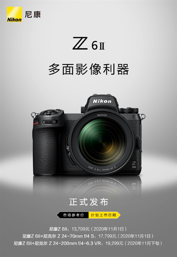 尼康Z6II最早11月1日上市,单机售价13799元,套机(配尼克尔Z 24-70mm f/4 S镜头)17799元,套机(配尼克尔Z 24-200mm f/4-6.3 VR镜头)19299元。