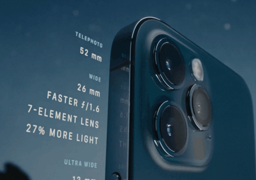 与去年的iPhone 11 Pro机型一样,Apple再次在iPhone 12 Pro上提供三摄像头系统,该系统具有12兆像素宽,长焦和超宽镜头。广角相机现在提供了更快的ƒ/ 1.6光圈,苹果公司表示,该功能可将弱光性能提高27%,而52毫米焦距远摄现在可以提供4倍光学变焦。