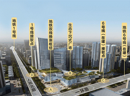 同时通过商业中庭、室外大型下沉广场辐射周边住区和办公,提高轨道交通的可达性,实现站城一体的转化,使得高效集约。轨道1号线B口与6号线G口也分别与项目南北两个端头无缝接驳,共生成5个TOD接驳节点,打造成为枢纽型TOD标杆项目。