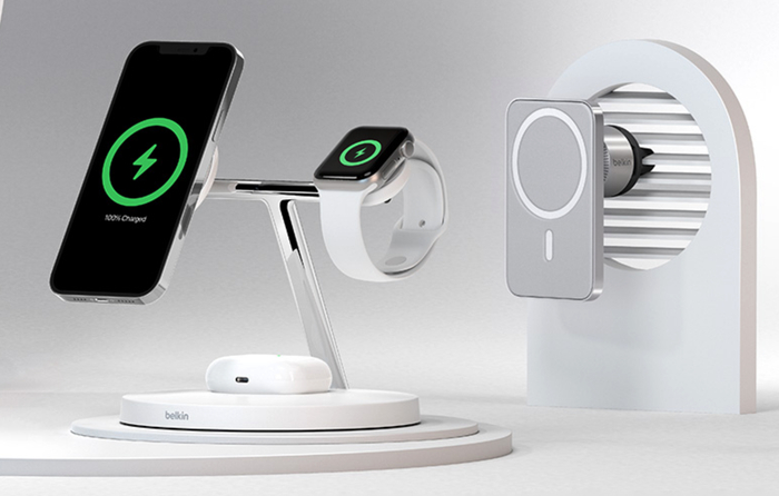 苹果表示未来会有更多第三方配件加入到 MagSafe 生态中。贝尔金已经展示了一个三合一的充电底座(iPhone、Apple Watch、AirPods),和一款车载磁吸充电器。