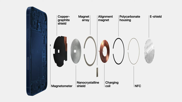 先来说说它现阶段的样子。首先手机上的 MagSafe 已经不只是磁吸接口,它代表的是一整套设计理念。iPhone 12 内部集成了充电线圈和磁铁阵列,能正确对到无线充电器的位置上,实现高效充电。MagSafe 磁吸配件中也包含对应磁体,可以轻松吸附,并且‘叠加’使用。
