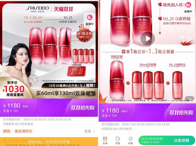 左为薇娅直播专属价格,右为资生堂官方店铺价格