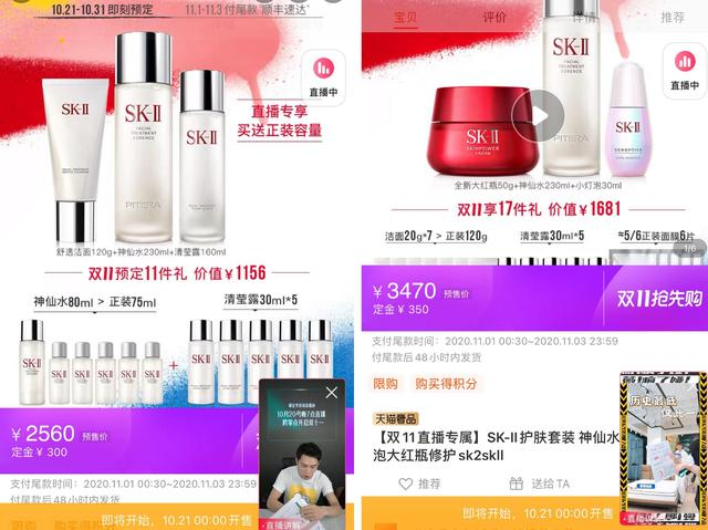 绝大多数国际品牌护肤品在直播间内的优势在于更多赠品。比如SK2神仙水,在薇娅和李佳琦的直播间内会多送20ml的小样。
