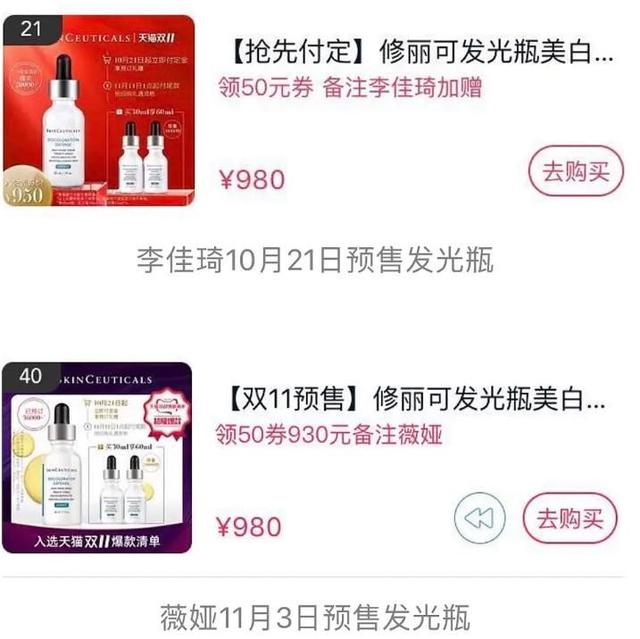 今年修丽可依然在两个直播间的预售直播中出现。但正如前文所述,修丽可采用不同SKU的投放方式来避免“正面比价”的低级错误。