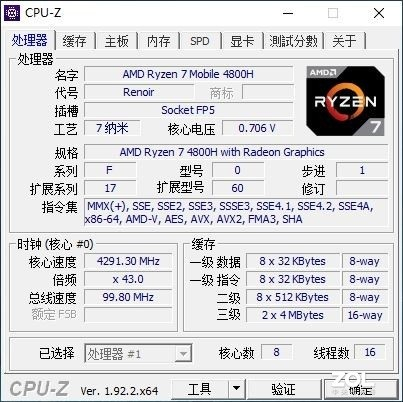 锐龙7 4800H拥有八核心十六线程,7nm工艺,Zen2架构打造,基准频率2.9GHz,最大加速频率4.2GHz,三级缓存8MB,TDP 45W,最大可支持DDR4 3200MHz内存,与同价位的竞争对手相比,锐龙7-4800H的核心数依旧占优,延续了其桌面处理器中的优势。