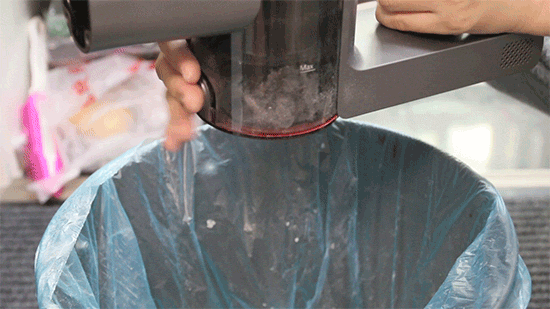 一键即可倾倒尘杯中灰尘,利用静电导流装置,可以看到尘杯中内壁灰尘吸附量减少。