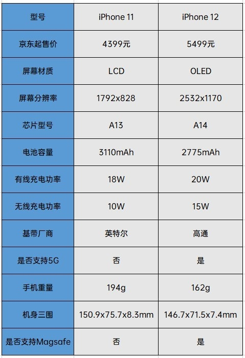 iPhone 11与iPhone 12差价1100元。两者并不难选,如果不在乎5G,购置iPhone 11即可;在乎5G,直接购置iPhone 12;如果追求更好的信号表现,买iPhone 12准没错。