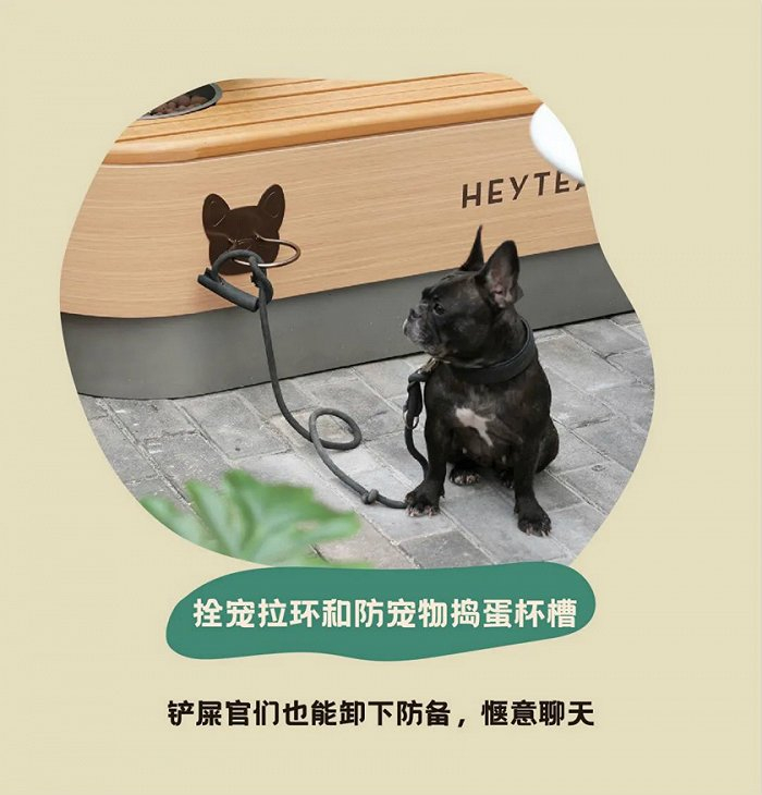 与星巴克类似,这家店被划分为户外区、就餐区和休闲区。在户外区域,喜茶打造了一个“爱宠休息站”,设置了阶梯式的座椅,让猫猫狗狗们可以在上面任意跳跃。同时也在座椅上及周边做了可供栓绳的立架、拉环,防止主人一不留神宠物就走远。此外,喜茶还准备了一次性手套、垃圾袋,以及宠物便便箱。