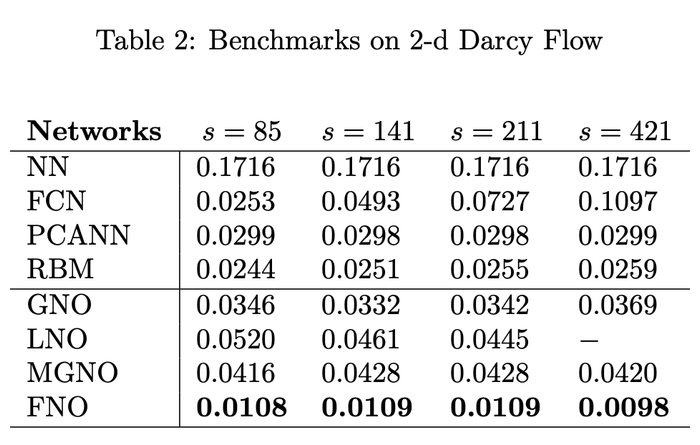 该实验结果参见图 2b 和表 2。FNO 方法的相对误差比其他方法几乎低了一个数量级,而且该误差值并不会随着分辨率的变化而变化。