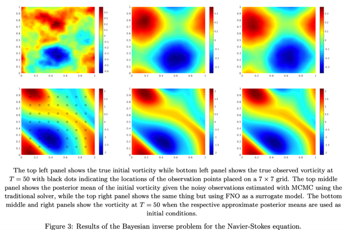 在 256×256 网格上,用于求解纳维 - 斯托克斯方程的伪谱方法用时 2.2 秒,而傅里叶神经算子的推断时间仅为 0.005 秒。该方法不仅具有巨大的速度优势,在下游应用(如解决贝叶斯逆问题)中使用时,其准确率也不会下降,如图 3 所示。