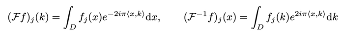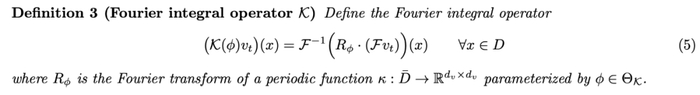 研究人员提出用傅里叶空间中定义的卷积算子替换掉 (4) 中的核积分算子。令 F 表示对函数的傅里叶变换 f : D → R^dv,F^−1 表示逆变换,则得到: