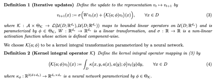 κ_φ 是从数据中学得的核函数。定义 1 和定义 2 构成了神经网络向无限维空间的泛化 [Li et al., 2020b]。如果我们移除对函数 a 的依赖,并使 κ_φ(x, y) = κ_φ(x−y),则得到 (4) 是卷积算子。