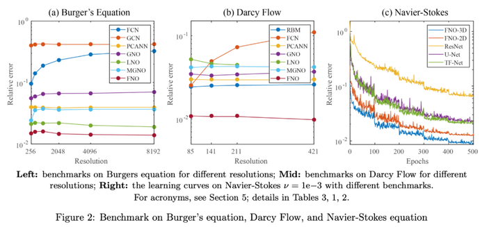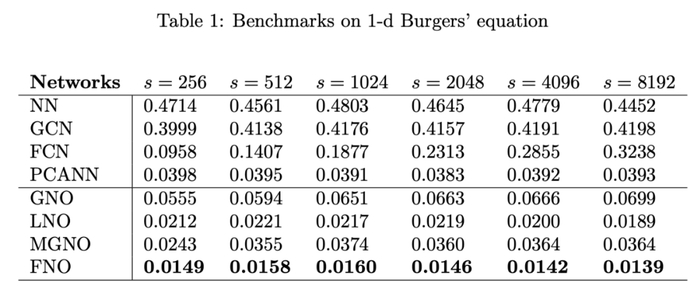 研究人员在伯格斯方程(Burgers’ equatio)、达西流动(Darcy flow)和纳维 - 斯托克斯方程(Navier-Stokes equation)上进行实验,FNO 超越现有的神经网络方法取得了 SOTA 性能,且与传统的 PDE 求解器相比,其速度快了三个数量级。